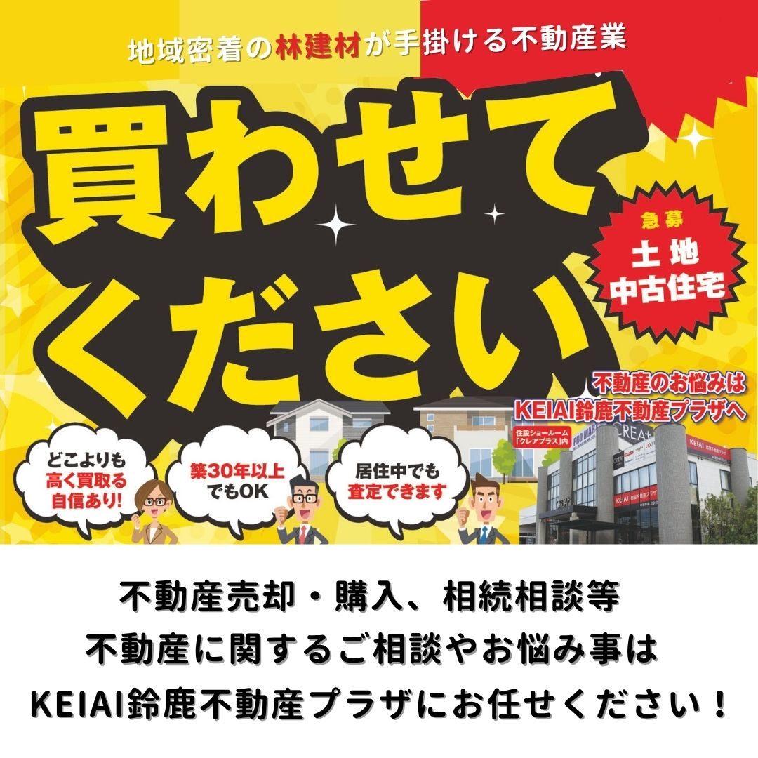こんにちは!KEIAI鈴鹿不動産プラザの渡邉です。今回は売却キャンペーンのご案内です!【不動産売却キャンペーン】期間:9/14(土)~10/14(月・祝)会場:林建材本社1階 クレアプラスシ...